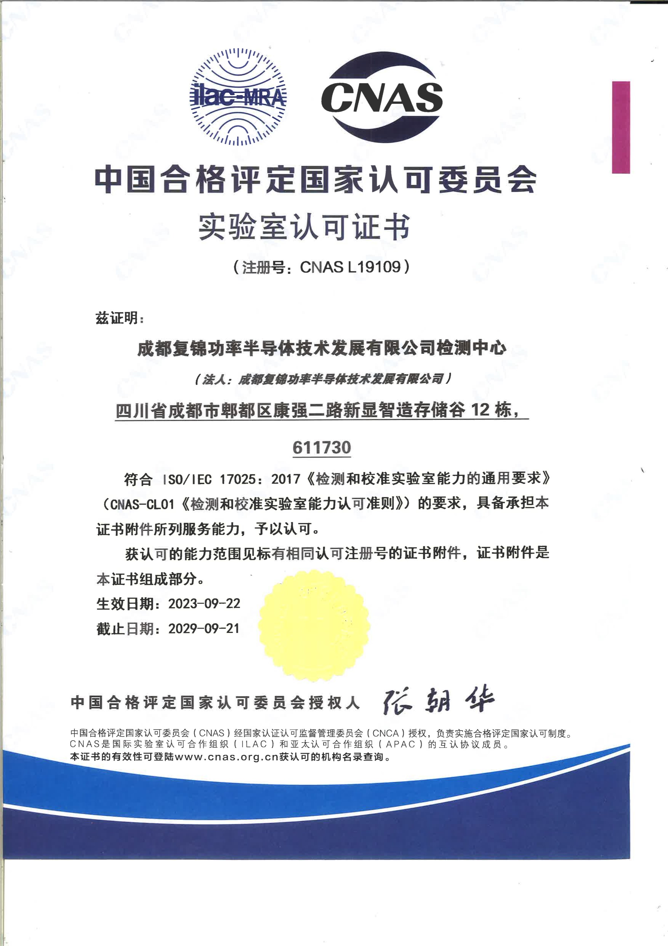 2023年9月22日,成都复锦功率半导体技术发展有限公司检测中心(下称“检测中心”)正式获得中国合格评定国家认可委员会颁发的CNAS实验室认可证书(注册号:CNASL19109),认可的检测能力范围囊括电子元器件产品大类,共计15个检测项。